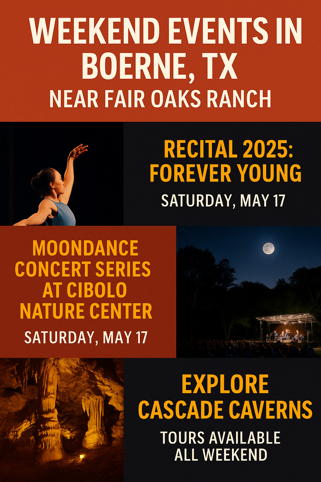 This weekend (May 17–18, 2025), Boerne is rolling out the red carpet with music, dancing, and cave exploring. These are all quick drives from anywhere in Fair Oaks Ranch and absolutely worth pulling yourself off the sofa for.
