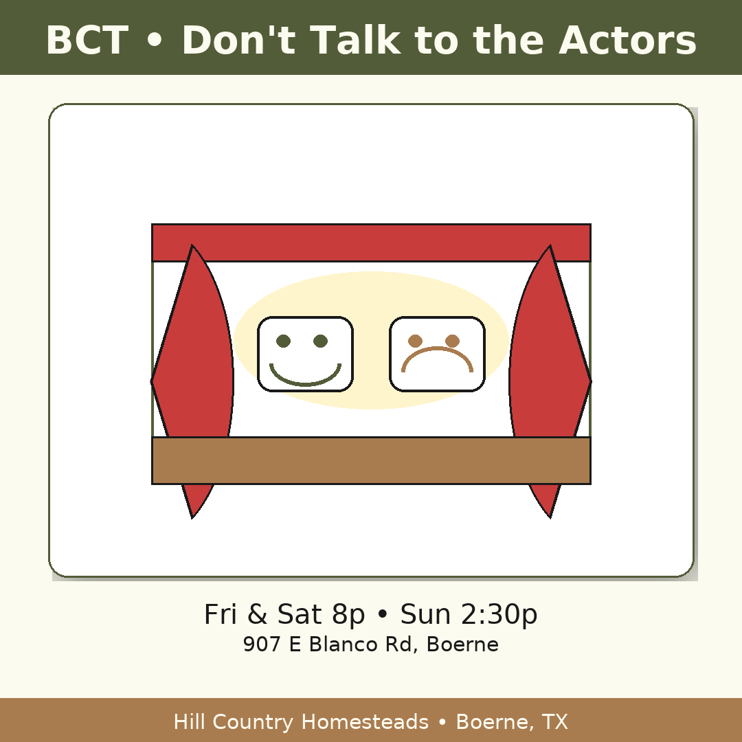 2) Boerne Community Theatre: Don’t Talk to the Actors (Fri/Sat 8 PM, Sun 2:30 PM) 🎭